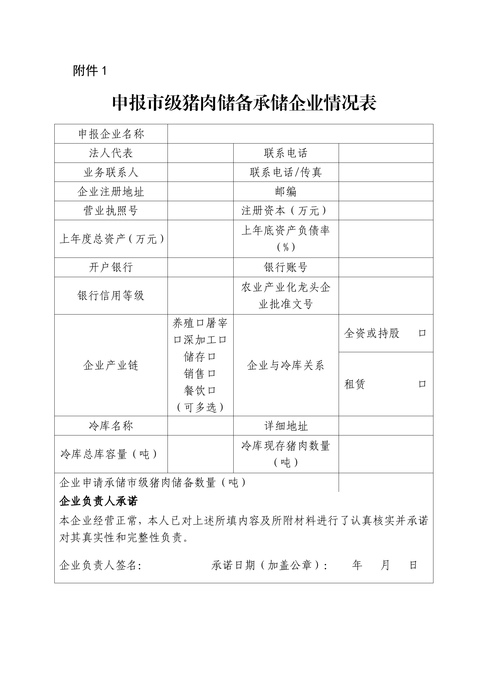 1.企业自愿纳入市级冻猪肉储备承储企业的申请;